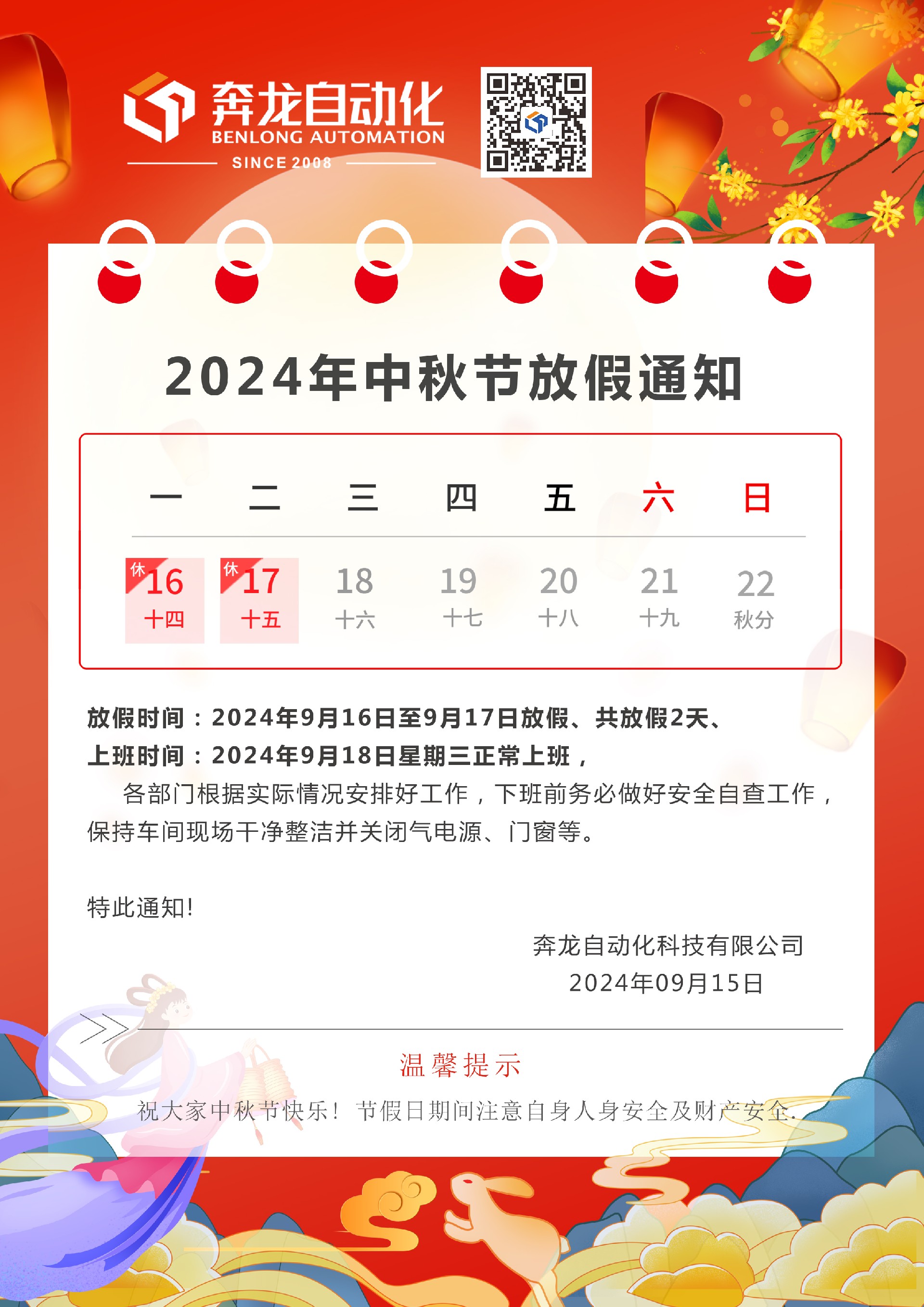 中秋节放假通知、给您带来不便敬请谅解!