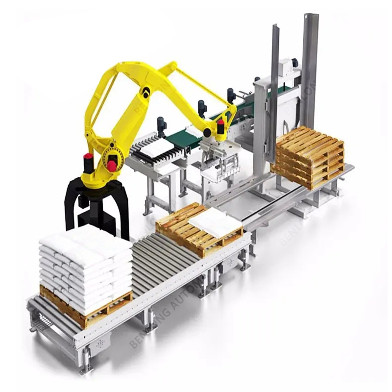 具有自动隔料分组、产品装袋、热封塑、小盒成型、产品装入小盒内、小盒贴标签、中盒成型、小盒产品装入中盒内、中盒贴标签、外箱自动成型、中盒产品装入外箱内、外箱自动贴标签、检测、喷码、封透明胶带、捆扎带、90°旋转、下料码垛、缺料报警等工序的在线监测、实时监控、质量溯源、条码识别、关键元器件寿命监测、数据存储、MES系统与ERP系统联网、参数任意配方、智慧能源分析与节能管理系统、智能装备服务大数据云平台等功能。