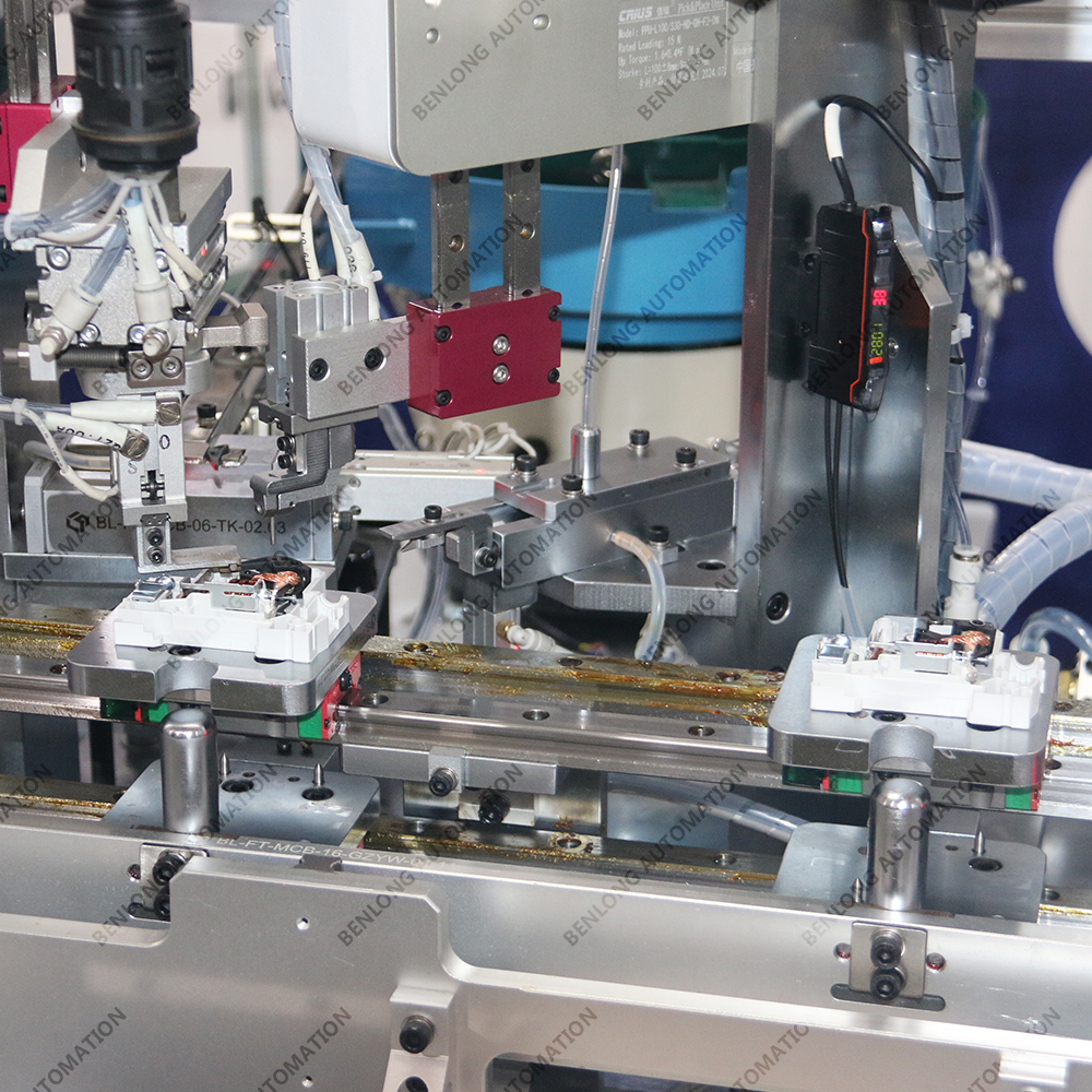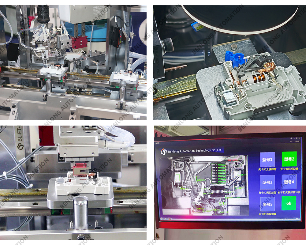 具有自动外壳上料、开盖、自动装配隔弧片、导磁片、7字片、大弹簧、手柄弹簧、调节螺丝、磁组件、接线柱组件、铁芯组件、双金组件、锁扣、锁扣轴、手柄轴、手柄、跳扣、跳扣轴、U型件、