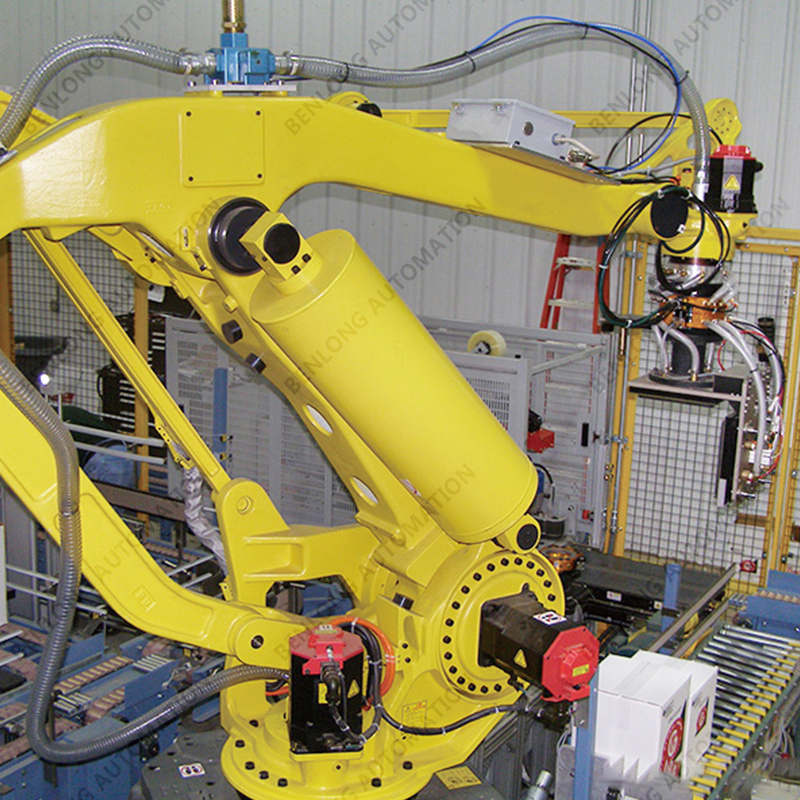 外箱自动成型、中盒产品装入外箱内、外箱自动贴标签、检测、喷码、封透明胶带、捆扎带、90°旋转、下料码垛、缺料报警等工序