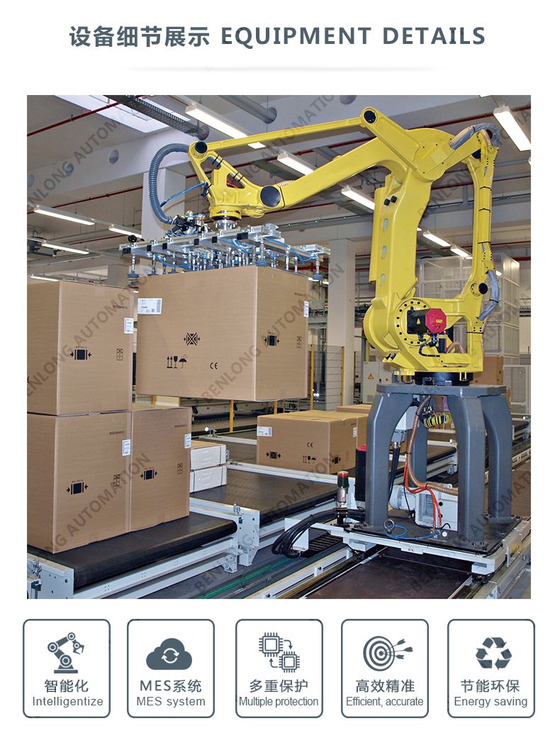 具有自动隔料分组、产品装袋、热封塑、小盒成型、产品装入小盒内、小盒贴标签、中盒成型、小盒产品装入中盒内、中盒贴标签、外箱自动成型、中盒产品装入外箱内、外箱自动贴标签、检测、喷码、封透明胶带、捆扎带、90°旋转、下料码垛、缺料报警等工序的在线监测、实时监控、质量溯源、条码识别、关键元器件寿命监测、数据存储、MES系统与ERP系统联网、参数任意配方、智慧能源分析与节能管理系统、智能装备服务大数据云平台等功能。