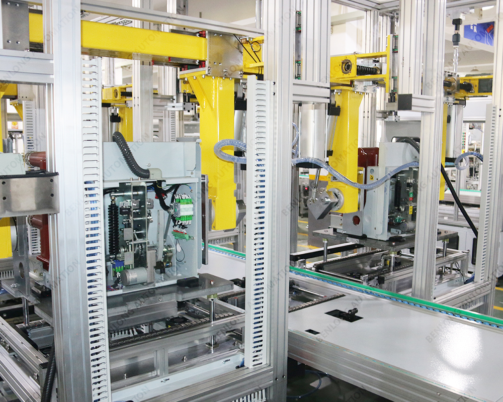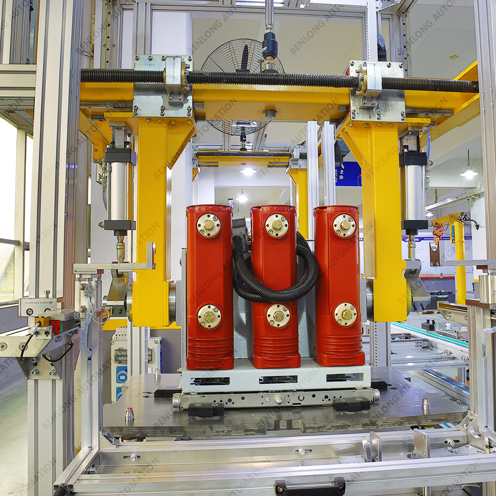 具有自动AGV物流输送、龙门架自动上料、倍速链物流、绝缘筒装配、灭弧室装配、初调装配、初调翻转、