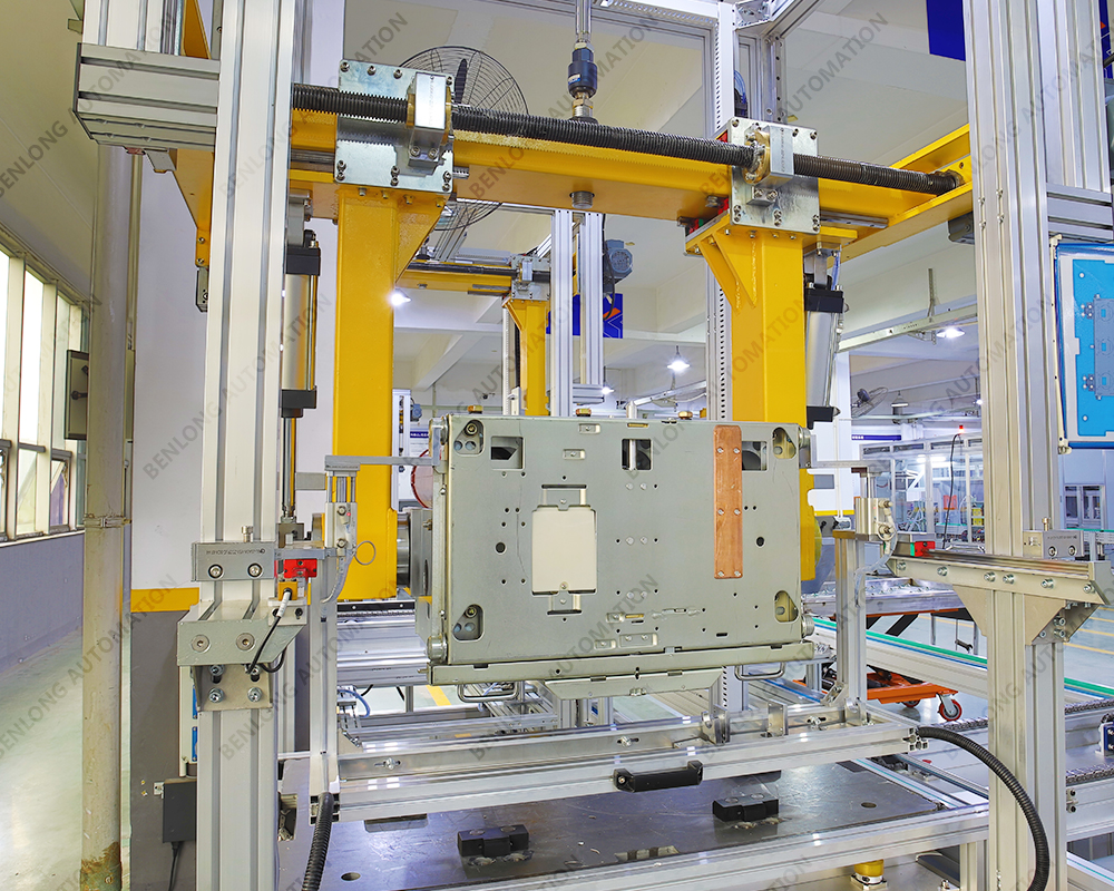 车翻转、底盘车接线、外观封板装配、二次综合检测、龙门架自动下料、包装、码垛、AGV物流输送、缺料