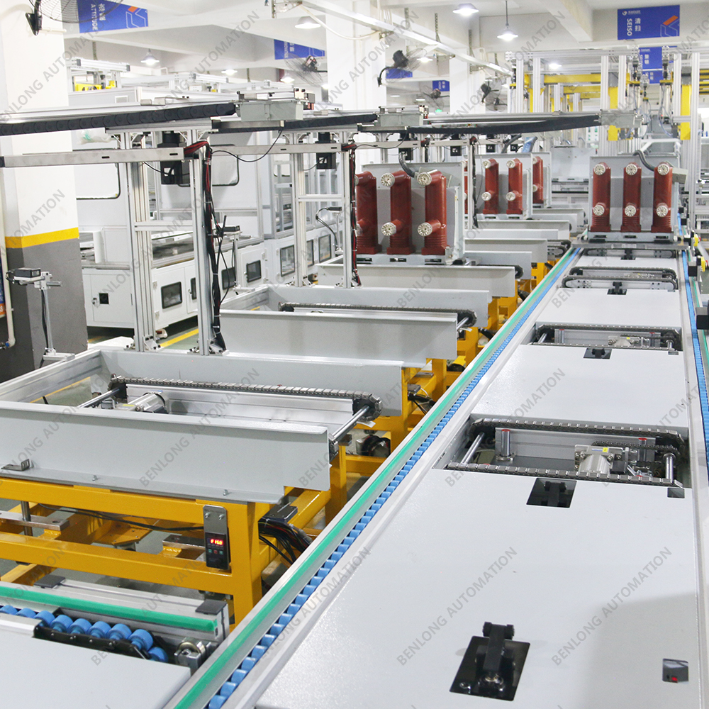 具有自动AGV物流输送、龙门架自动上料、倍速链物流、绝缘筒装配、灭弧室装配、初调装配、初调翻转、机器人锁螺丝、开距、