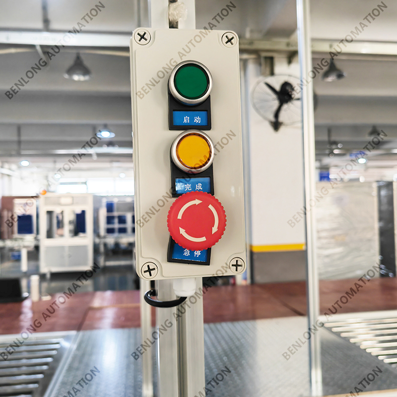 个工位处设置线体传送的启停控制按钮和工位完成指示灯。其中每个工位上的控制指示灯位置要让每个工位的操作人员都能够看到,当本工位装配工